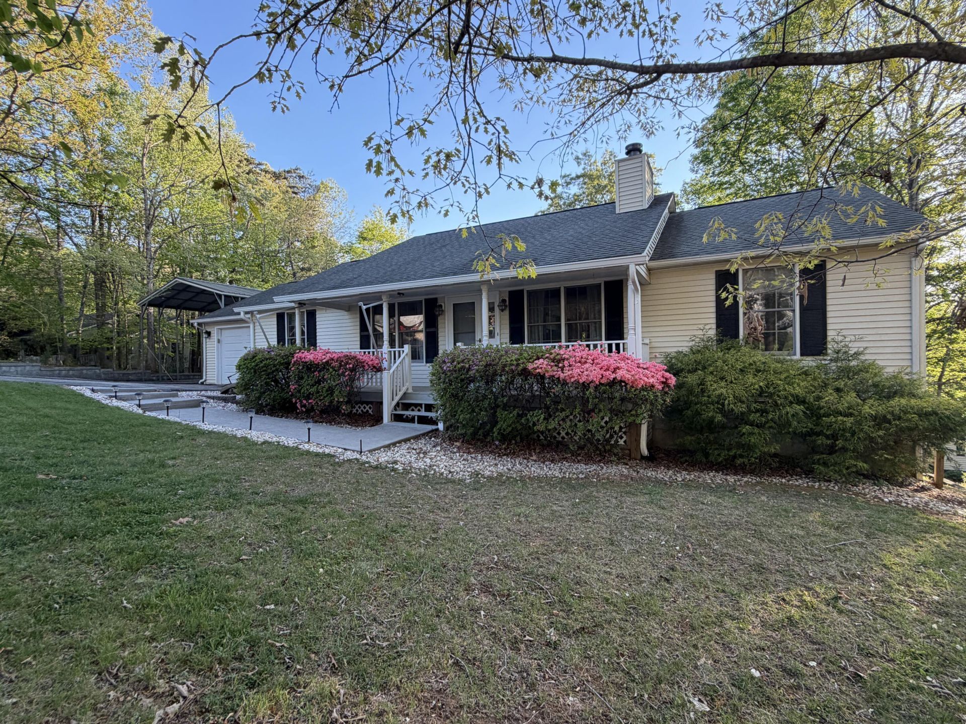 Welcome to this great vacation home at Smith Mountain Lake with lake access and deeded boat slip. Enjoy one floor living featuring a split bedroom design 3 Bdr / 2bth, living room with wood burning fireplace, large dining area, kitchen, 18 x 18 heated and cooled sunroom with steps to lower level workshop basement, and a 14x24 attached garage. Outside features 2 car carport, and a large 22 x 35 garage building with 12 by 14 ft wide front door and four total roll-up doors for a uniquely covered playhouse concept or outside entertainment and boat storage in winter. Enjoy gardening with the fenced in vegetable garden and wooded picnic area. Community boat launch, docks and swim ladders. Community Pool. Excellent Westlake location.